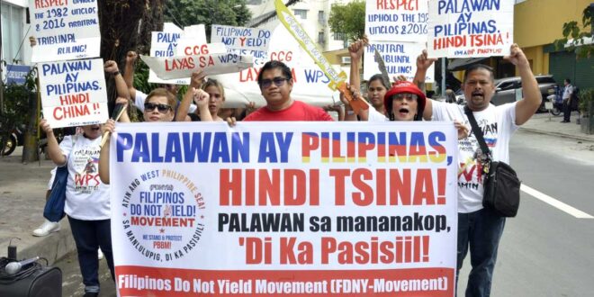 NAGPROTESTA ang isang bagong kilusan na kinabibilangan ibat-ibang grupo ng makabayang Pilipino sa harap ng Embahada ng Tsina sa Makati upang tahasang tutulan ang pagpapakalat ng mga maling impormasyon upang maangkin ang isla ng Palawan.