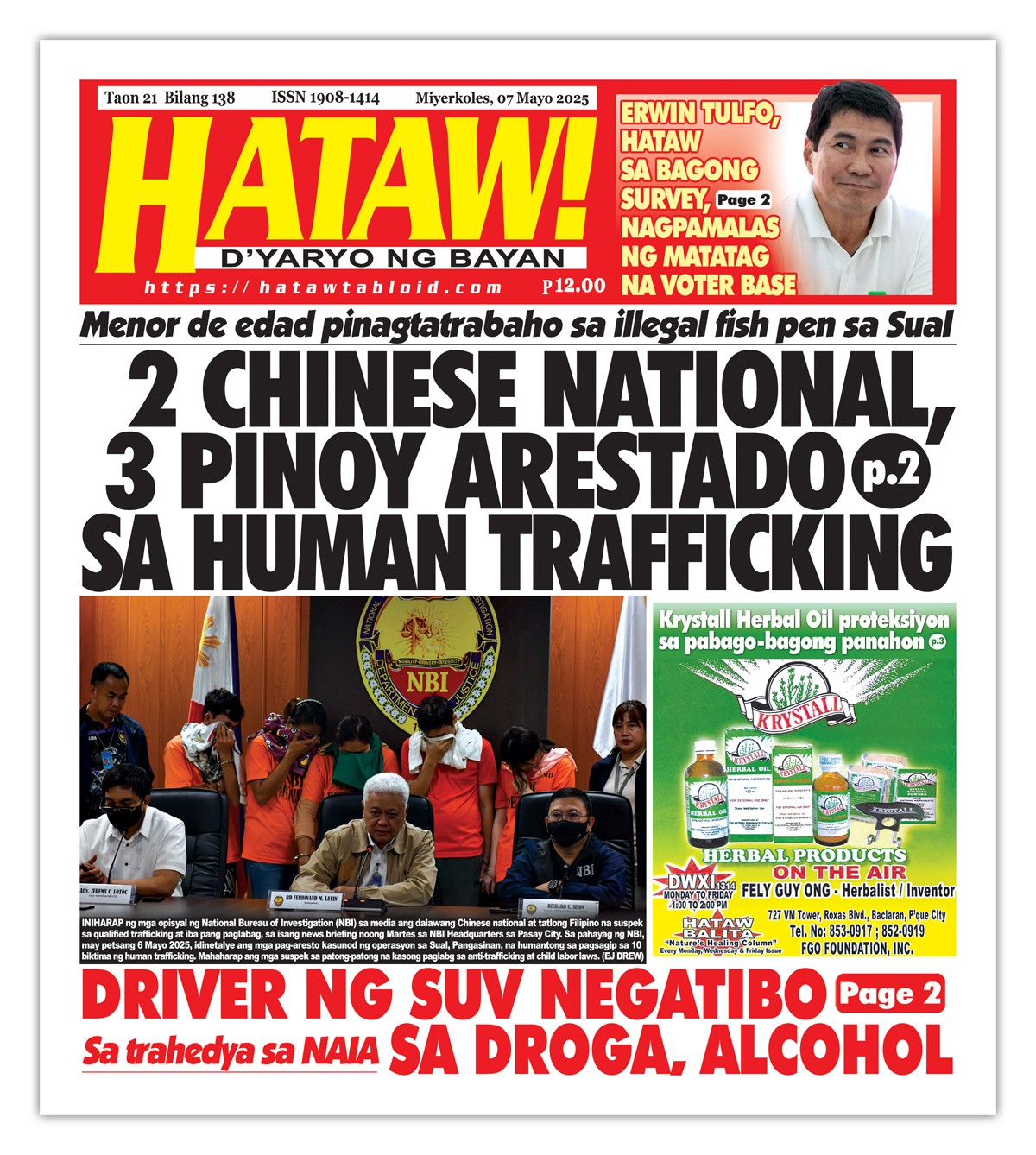 DALAWANG Chinese national at tatlong Pinoy ang inaresto matapos iturong sangkot sa human trafficking habang nasagip ang 10 biktima sa pagsalakay ng National Bureau of Investigation (NBI) sa isang palaisdaan sa Sual, Pangasinan nitong 1 Mayo.