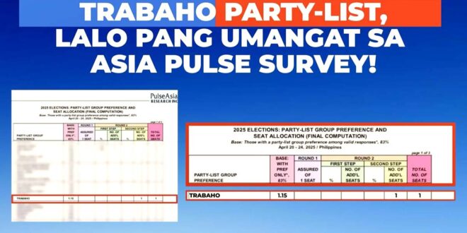 PITONG ARAW bago ang nakatakdang halalan, naglabas ang Pulse Asia Research, Inc. ng survey kung saan ipinakitang maluluklok sa kongreso ang TRABAHO Partylist (numero 106 sa balota).