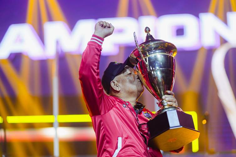 Benigno De Guzman Casayuran kissing his GTCC: Summer Showdown championship trophy.