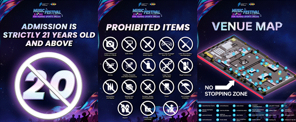 Gates will open at 11:00 AM, with main stage performances starting at 8:00 PM. Only guests aged 21 years and above are allowed to enjoy this exciting day. Guests are also reminded to check the venue map and list of prohibited items for a smoother and more enjoyable experience.