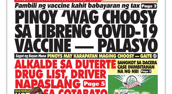 ni ROSE NOVENARIO HINDI puwedeng maging choosy ang mga Pinoy sa tatak ng CoVid-19 vaccine na ituturok sa kanila dahil ito’y libre, ayon sa Palasyo. “Totoo po, mayroon tayong lahat na karapatan para sa mabuting kalusu­gan pero hindi naman po puwede na pihikan dahil napakaraming Filipino na dapat turukan,” ayon kay Presidential Spokesman Harry Roque sa virtual Palace press briefing. …