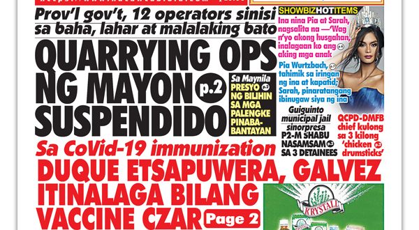 IPINATIGIL ni Environment Secretary Roy Cimatu ang lahat ng quarrying operations sa paligid ng bulkang Mayon halos dalawang oras matapos siyang utusan ni Pangulong Rodrigo Duterte na imbestigahan ito. Nagsagawa ng aerial inspection kahapon si Pangulong Duterte kasama si Sen. Christopher “Bong” Go sa Catanduanes at Albay upang makita ang lawak ng pinsalang idinulot ng bagyong Rolly sa dalawang lalawigan …