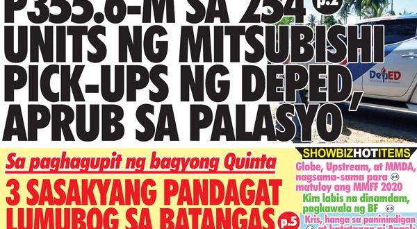 APRUB sa palasyo ang pagbili ng Department of Education (DepEd) ng 254 units ng Mitsubishi pick-up na nagkakahalaga ng P355.6 milyon sa panahong umiiral ang CoVid-19 pandemic. Umani ng batikos mula sa netizens ang pagpapakita ng luho ng DepEd sa pagbili ng 254 units ng pick-up sa halagang P1.54 milyon kada isa para gamitin ng district engineers sa gitna ng …