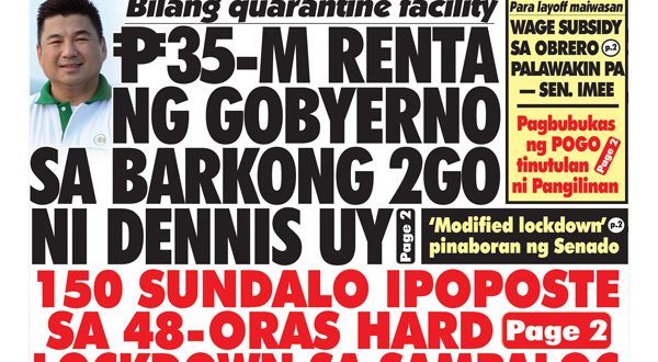 TULOY-TULOY ang suwerte ni presidential crony Dennis Uy dahil nagbabayad ang gobyerno ng P35 milyon sa kanyang logistics company na 2GO Group Inc., para magamit ang dalawang barko na pagmamay-ari nito bilang quarantine facility ng mga taong pinaghihinalaang positibo sa coronavirus disease (COVID-19). “Nirerentahan po ito ng gobyerno, ‘yung dalawa mga P35 million ho. Mura naman ‘yan at nagamit if …