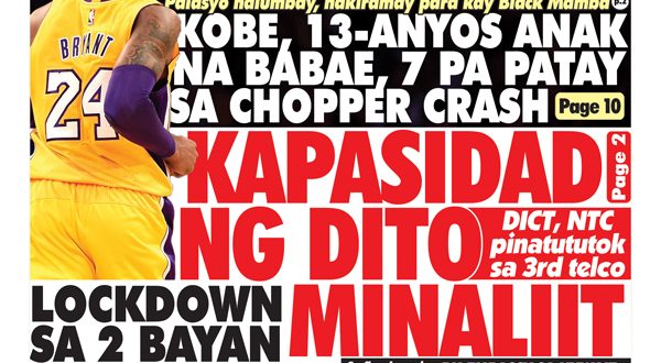 NAKIIISA ang Palasyo sa pagdadalamhati ng buong mundo sa pagpanaw kahapon ni basketball legend Kobe Bryant sa isang chopper crash sa California kahapon. Sa isang kalatas, sinabi ni Presidential Spokesman Salvador Panelo na si Bryant, 41 anyos, dating Los Angeles Lakers star, ay mahal na mahal ng kanyang Pinoy fans. “The Office of the President is saddened after learning about …