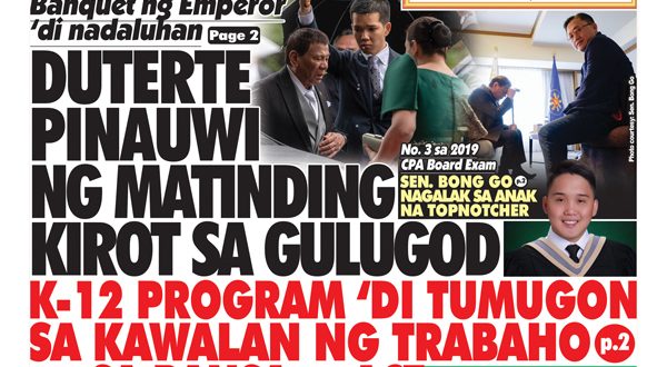 NAG-UUMAPAW ang kagalakan ng pamilya ni Senador Christopher “Bong” Go nang pumangtalo sa October 2019 CPA board exams ang anak na si Christian Lawrence. “I am very proud of my son. Hindi ko mailarawan ang kaligayahang nadarama ko ngayon. Nagkataon na pareho kaming top 3 — ako noong nakaraang halalan at siya ngayon naman sa CPA licensure exams,” ayon sa …
