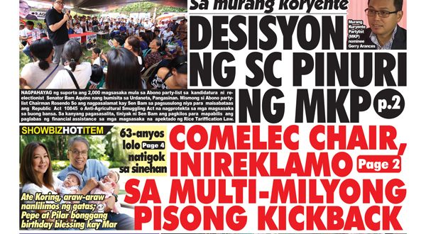 PORMAL na ipinagharap ng reklamo si Commission on Elections (Comelec) chair Toto Abas sa Malacañang Presidential Complaint Center ng pambubulsa ng daan-daang milyong piso kapalit ng pagpabor sa tatlong malalaking kompanya na magsisilbing logistic provider sa darating na midterm poll sa 13 May 2019. Sa apat na pahinang reklamo na natanggap ng Office of the President noong 30 Abril 2019, …