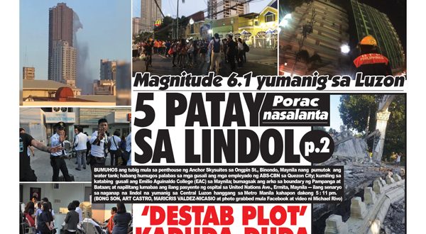 LIMA katao ang binawian ng buhay habang 20 ang sugatan matapos yanigin ng malakas na lindol ang Luzon kabilang ang lalawigan ng Pampanga nitong Lunes nang hapon. Sinabi ni Gob. Lilia Pineda ng Pampanga, dalawang matanda ang binawian ng buhay sa bayan ng Lubao at tatlo pa ang nasawi sa gumuhong gusali a bayan ng Porac. Dagdag ni Gob. Pineda, …
