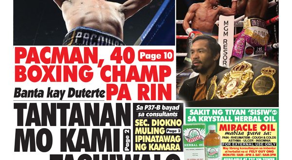 NAKIISA ang Palasyo sa sambayanang Filipino sa pagdiriwang sa pagkopo ni Sen. Manny Pacquiao sa WBA welterweight title laban sa Amerikanong si Adrien Broner. Sa kalatas ay sinabi ni Presidential Spokesman Salvador Panelo na hindi naging hadlang ang 11 taon tanda ni Pacquiao kay Broner sa ipinamalas na gilas ng mambabatas sa pakikihamok sa American boxer. “We thank our pound-for-pound King …